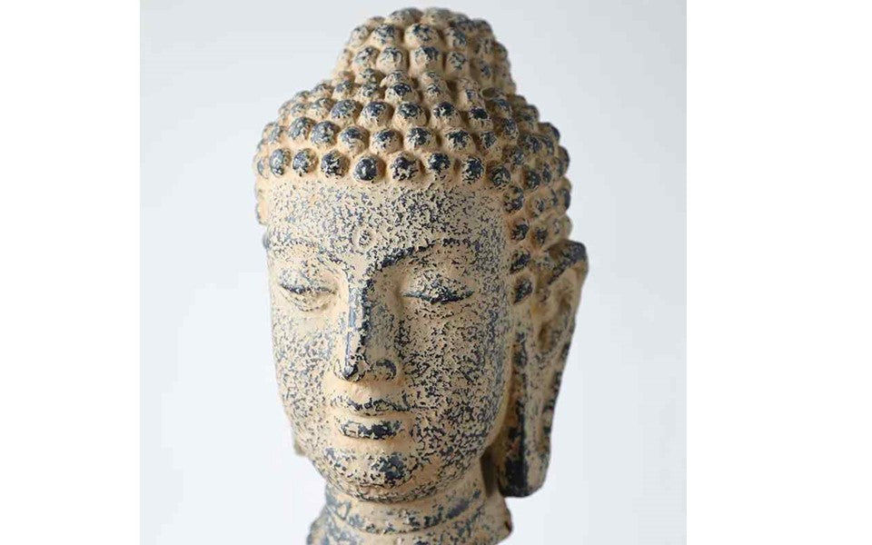 Buddha head sculpture on a stand, zen, asian-inspired, and rustic décor styles,