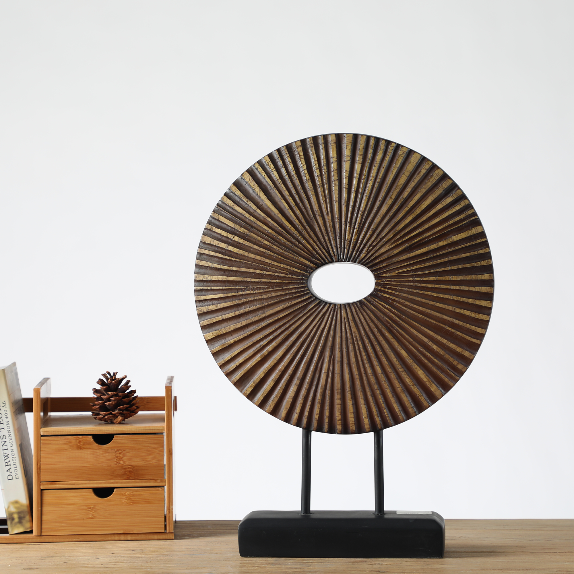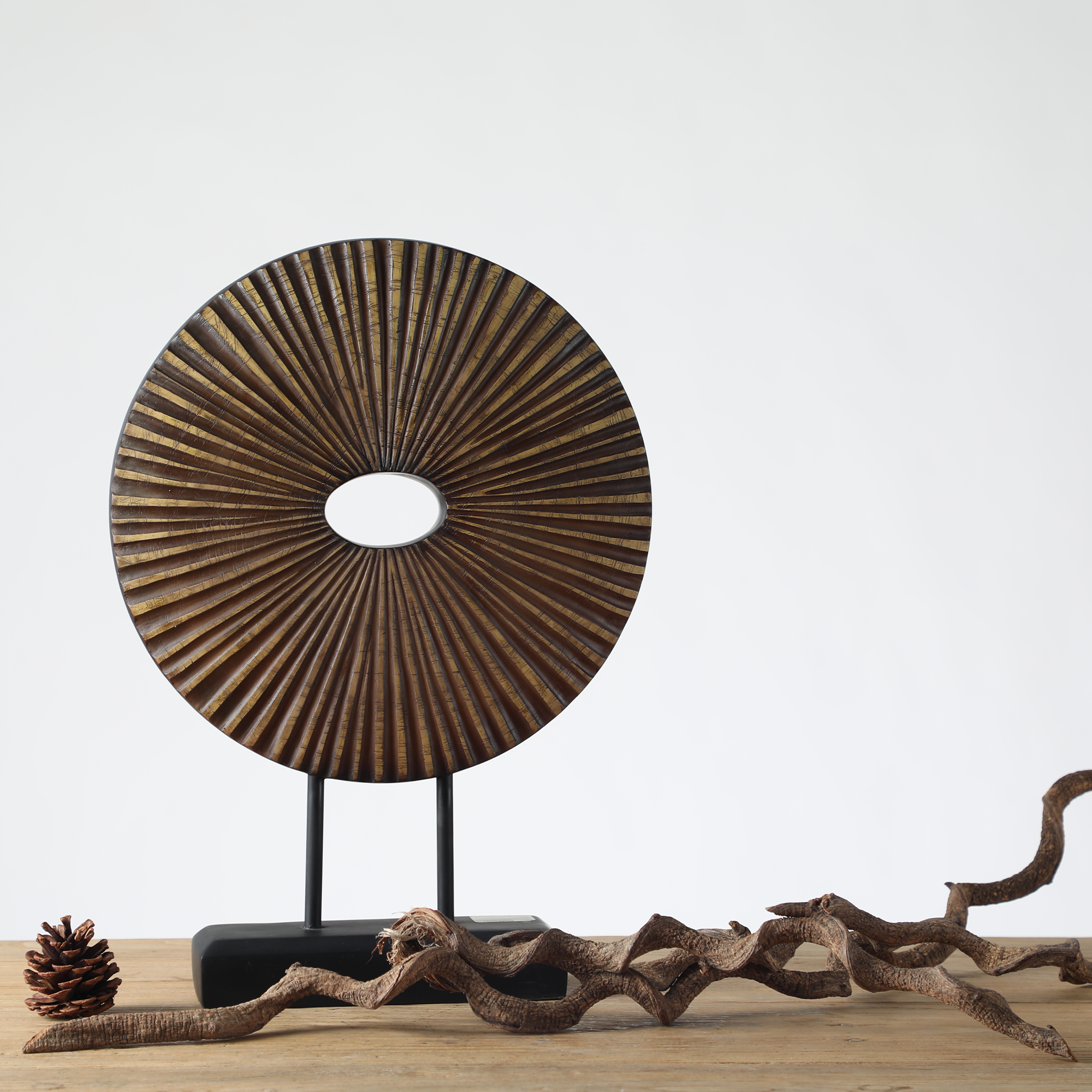 Modern tribal, sculptural, and organic contemporary,circular disc shape with radiating textur