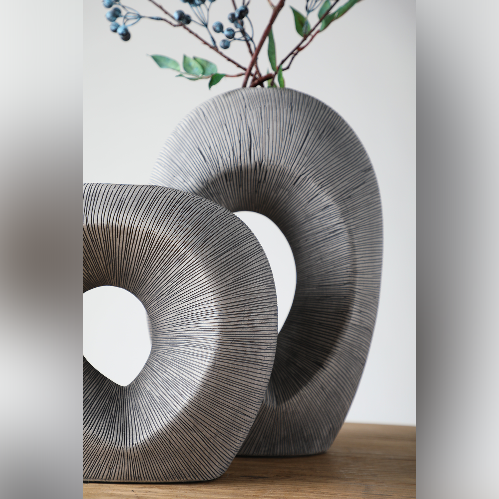 Modern sculptural, organic, and tribal-inspired,abstract, open-circle form, vase