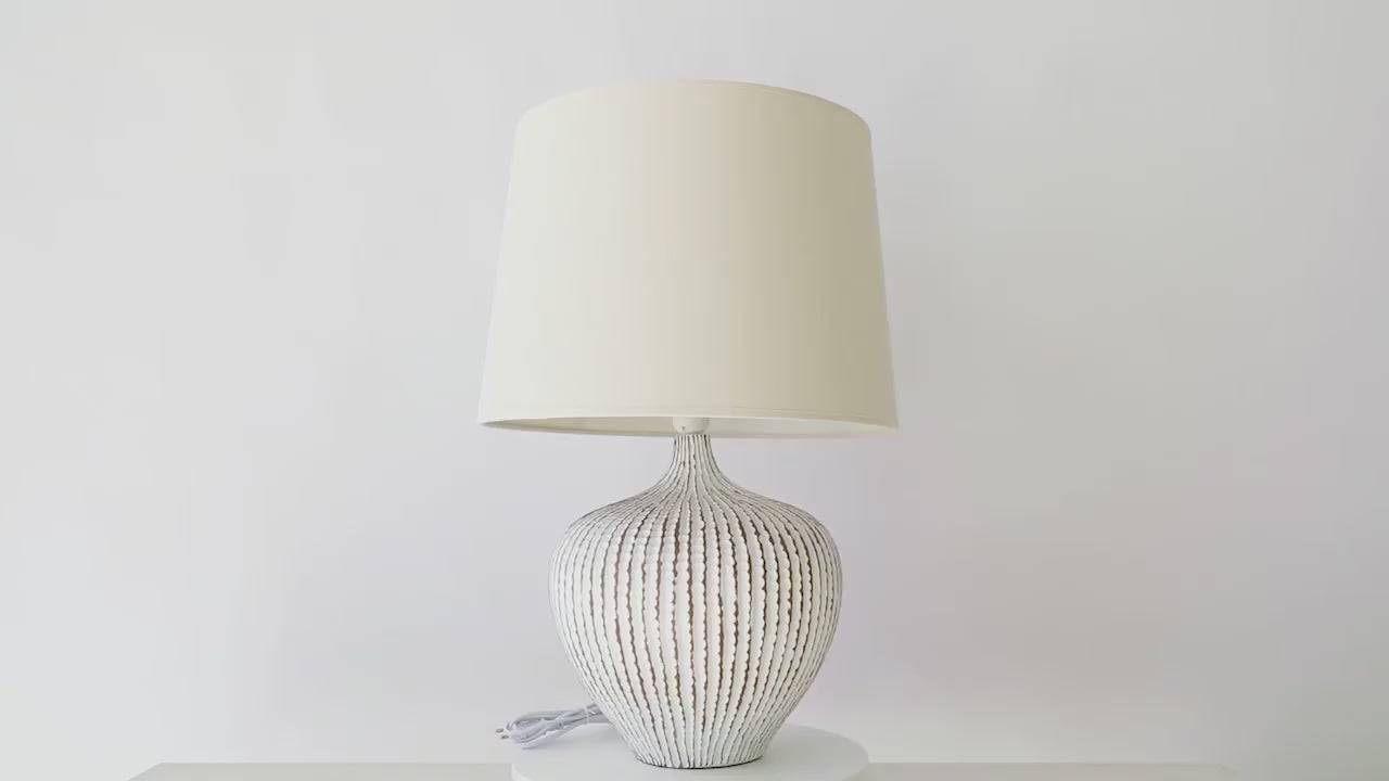 - Material & Texture: The base features a vertically grooved texture with distressed whitewash finish, mimicking hand-thrown pottery—evoking a handcrafted and organic vibe.