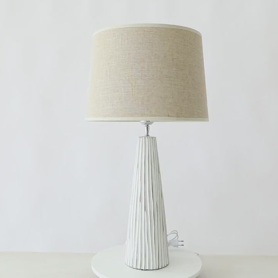 - Tapered Textured Base – The base is tall, slender, and conical, featuring vertical grooves or ridges. This gives it a handcrafted, organic feel, often found in rustic or farmhouse-inspired designs.